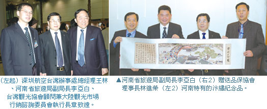 於去年11月開放、成為16個新一波開放的兩岸空中直航航點城市之一的鄭州,為了進一步促進兩地的直航航班開拓事宜,包括省旅遊局、機場、飯店以及旅行社等旅遊相關單位共組成了超過百人的聯合考察團,於2╱8搭乘直航包機由鄭州直飛來台,於台灣停留7天並拜會旅遊相關部門,希望能夠積極促成直航相關事宜,而河南旅遊協會則於日前拜會品保協會交換心得意見。