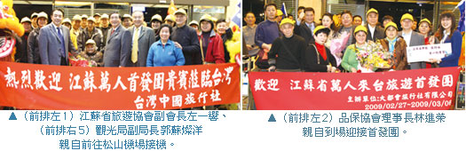 而在南京祿口機場舉行的「江蘇萬人遊台灣」啟動儀式,包括江蘇省旅遊局長周乃翔、副局長張驥、副巡視員唐建國,南京市旅遊局長曹永林,東航江蘇公司副總經理羅來宏,南京祿口國際機場副總經理徐勇,華航南京辦事處洪志明經理等也共同見證了這歷史性一刻。