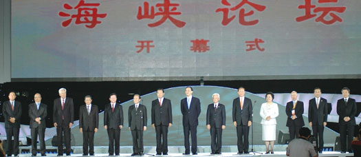▲ 海峽論壇開幕邀請兩岸代表共同見證,(左起)海峽兩岸關系協會會長陳雲林、台中市長胡志強、中國全國政協副主席羅豪才、台灣無黨團結聯盟主席林炳坤、中國全國政協副主席兼秘書長錢運錄、新黨主席郁慕明、中共中央政治局常委賈慶林、國民黨副主席╱桃園縣縣長朱立倫、中國全國人大常委會副委員長周鐵農、親民黨秘書長秦金生、全國政協副主席林文漪、民進黨前主席許信良、國務院台辦主任王毅、福建省委書記盧展工。