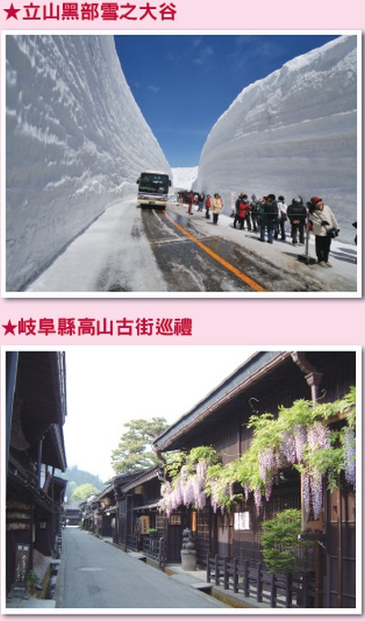 由立山黑部串起的長野、岐阜、富山三縣廣域旅遊路線中,有壯麗的自然風景、傳統老街、國寶古蹟等景點,立山雪壁及三縣充滿特色的景點,可推出豐富的行程。立山黑部從4月 ∼7月,室堂都能享受玩雪樂趣,中部地區的人文歷史景點以及秀麗自然風光也為行程重點,可安排前往岐阜縣郡上、高山等代表性的歷史街道,及長野縣世外桃源般美麗的上高地等特色景點。除了玩雪體驗外,豐富內容讓商品行程不受季節限制,更多元化發展。