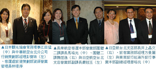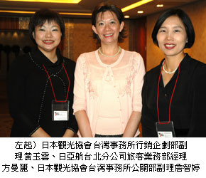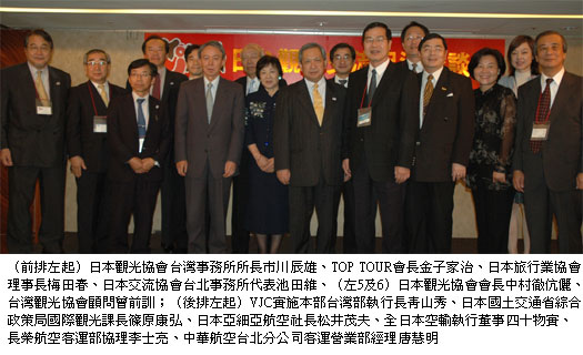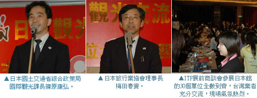 專程來台參與ITF開幕的日本觀光協會會長中村徹表示,「去年日本造訪台灣的遊客數約有112萬、造訪日本的台灣遊客更達127萬人之多,而未來將持續推廣日本全國各地的觀光產業,使日台雙方觀光事業都更加興盛昌榮。」他並於晚宴中指出,「未來日本旅遊市場的推廣將有三大重點,分別是個人旅行、教育旅行及獎勵旅遊。由於台灣旅客到日本旅行已非常普遍,所以在市場取向上也將以招攬再次造訪的重遊客為取向。」而應邀與會的南投縣長李朝卿也表示,非常希望將來台日雙方能以點對點包機的形式,促進兩地旅遊的互相交流和經驗學習。