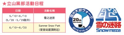 此外,根據天氣預報,黃金周之後的天氣安定,晴天的機率十分高,是欣賞這壯闊雪景的絕佳好時機。今年適逢漫步大雪谷20 周年紀念,除了有一直以來舉辦的漫步大雪谷活動、以及大小朋友最愛的夏雪樂園(Summer Snow Park)之外,為慶祝20周年紀念還有「雪之迷宮」盛大登場,讓人穿梭在雪白的世界中,是不同於一般的迷宮體驗,讓遊客能更盡興體驗雪之魅力。一直到6月中旬為止,前往立山黑部都能感受這令人感動的雪國風情。