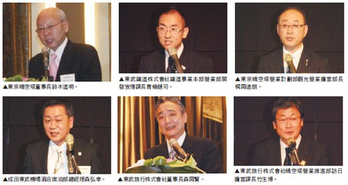 去年5╱22開幕的東京晴空塔,隸屬於東武鐵道集團,至今已經吸引超過500萬人次造訪,其附設商場更湧入超過4,400萬人次前往觀光。為爭取更多海外遊客,東武集團瞄準台灣市場,帶領旗下東京晴空塔、東武鐵道、東武飯店、東武旅行、東武酒店管理公司等首度來台召開同業說明會。