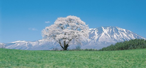 ▲小岩井農場的一本櫻搭配岩手山的融雪風景如畫一般。