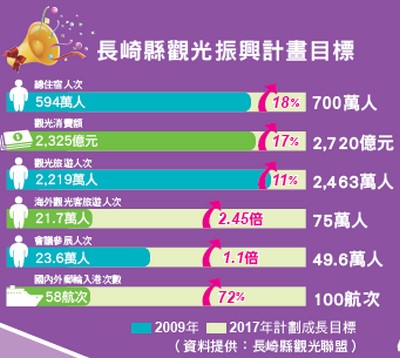據長崎縣觀光聯盟的統計,2012年前往長崎的主要過夜旅客較前年成長3.4%,其中訪日外國觀光客成長有 31.8%,台灣市場成長71.7%。為了吸引更多觀光客前往,長崎縣在2009年制定了觀光振興計畫,期望在2017年達到700萬人次的總過夜觀光客目標,外國觀光客亦可達75 萬人次。在此基礎下,長崎縣擬定多項推廣計畫,隨著旅遊型態從以往的團體行程,朝向小團體、自助旅遊發展,長崎縣在觀光推廣上,將朝體驗、見學、產業觀光、農村體驗等多樣旅遊魅力為主;交通選擇上,除了航空補助計畫,郵輪進駐也是另一重點項目;另外透過九州新幹線的全線開通,連結週邊縣市整合區域推廣,提升整體的觀光旅遊魅力,吸引更多旅客。