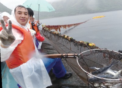 換上漁師專用的工作服、救生衣與膠底鞋,化身為專業的漁夫。跟著漁船乘風破浪,儘管考察當天遇到大雨,仍舊不減興致。約 15分鐘船程,拿網子將一隻隻活蹦亂跳的竹筴魚、鰤魚、飛魚、花枝、鯛魚等通通捕撈上岸,十足的費盡力氣。上岸後,即可品嘗新鮮的生魚片料理。漁船會盡量選擇風浪平穩的日子出海,並為每位旅客投保,業者無須擔心安全問題。