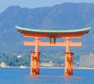 1168年時由平清盛修建而成,建築物以海面為地基,位於彌山原生綠林與瀨戶內海間,漲、退潮時景致皆不同,是日本3景之一,並已於1996 年12月、在聯合國科教文組織第20 屆世界文化遺產委員會梅里達會議為上,列入世界文化遺產。