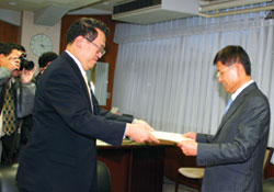 野縣飯田市市長牧野光朗(圖左)於日前頒贈「感謝狀」與台灣CITY PAK主要成員,以此向招攬台灣旅客前往日本中部奧飛驒觀光的得益、金龍、新進、理想、錫安、長安、洋洋等旅行同業致謝,其中得益旅行社總經理張漢水(圖右)獲贈代表日本傳統技藝的水引工藝品,而今後預計推出具有潛力的親子團以達更亮眼的送客成績。(撰文>編輯部 圖片提供>得益旅行社)