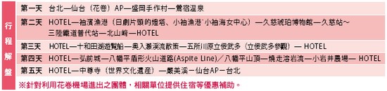 此2大航班每週飛航週四及週日,利用週日出發的航班包裝5 天4夜的行程,更利於同業銷售。向日遊顧問公司在此次的北東北提案中,將2縣最具優勢的溫泉資源以及無形文化財產結合,打造出最具深度的人文旅遊。歡迎旅遊同業多加利用推廣與詢問。