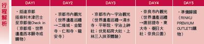 秋冬時節的關西地區魅力無限,楓葉季與冬季白雪讓古樸風雅的世界遺產群更具魅力。季節限定的點燈活動也是旅遊的重點之一,美麗的琵琶湖景致更是不容錯過。由向日遊代理的京阪集團針對團體與FIT2大客群,推出量身訂做的2款行程。團體客群行程著重於各式文化與美食的體驗,安排乘坐大阪水上巴士、坂本纜車與琵琶湖汽船,並規劃探訪世界文化遺產景點與點燈活動,行程豐富。FIT行程則將重點放在京都、奈良的10大世界文化遺產巡禮,利用「ICOCA&HARUKA」或是「關西周遊卡KANSAI THRU PASS 3日券」自由暢遊京阪奈良。