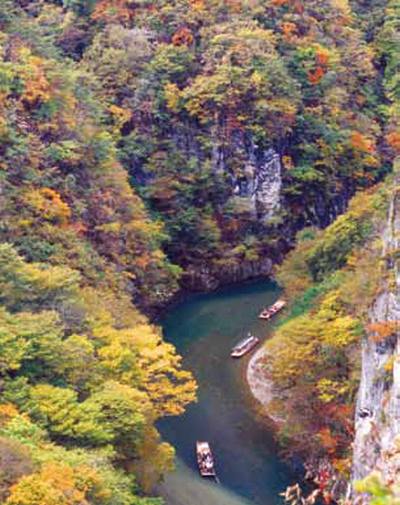 猊鼻溪賞楓推薦期-10月下旬~11月上旬猊鼻溪擁有日本3大溪流的美稱,由砂鐵川經年累月侵蝕石灰岩而成。溪谷長達2公里,四季景色分明,其中又以秋季的乘船賞楓最受旅客歡迎。乘著船欣賞沿途兩岸高聳的峭壁與楓紅美景,聽著在溪谷間迴盪的猊鼻追分民謠,視覺與聽覺都獲得享受。