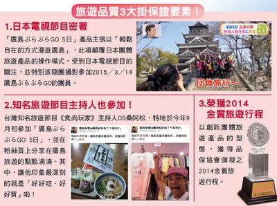 「廣島ぶらぶら(BuRaBuRa )GO 」產品分別由旅居廣島多年的松田依子,以及精通中文的日本姑娘─溝下佳子帶路,以熱情、專業的解說,給予旅客如朋友同遊的感受。有別於一般團體旅遊使用大巴士觀光的模式,行程利用廣島路面電車的「廣島Free Pass」暢遊廣島市內的各大景點。選擇下榻市中心飯店「RIHGA ROYAL」,便於旅客參觀及血拼。因此,旅客將擁有最多觀光時間,盡情欣賞日本3景之一的「宮島嚴島神社」,以及遊歷景區內的大聖院、紅葉谷等。嚴選餐食,無論是牡蠣屋、廣島燒、法式套餐、香之月御膳會席料理等當地知名餐廳,顧及旅客的味蕾享受。