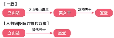 ‧交通部分旅遊人數過多時,立山站經美女平往室堂間的路段可選擇變更為搭乘替代巴士。