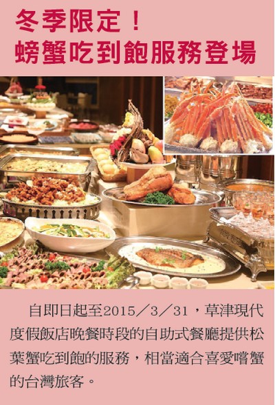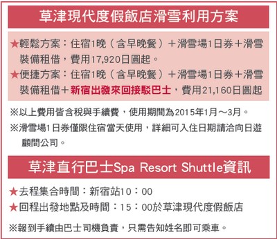 冬日最極致的享受不外乎是泡在暖呼呼的溫泉中,欣賞 雪花紛飛的銀白世界。但除了泡湯之外,近年來隨著 滑雪旅遊的興起,國內前往日本滑雪的遊客也日益增多,因 此同時結合滑雪場與溫泉設施的度假方式在旅遊市場中也越 趨熱門。針對喜好雪上活動且自主性高的自由行旅客,向日 遊顧問公司結合擁有世界級規模的草津國際滑雪場及日本3 大名湯之一的草津溫泉,特別推薦優質住宿「草津現代度假 飯店」所推出2天1夜的泡湯滑雪輕旅行,搭配由新宿出發的 東京草津巴士接駁,旅客無需轉乘可輕鬆前往草津體驗滑雪 溫泉雙重豪華行程。此外,草津現代度假飯店自即日起至明 年3月底也推出松葉蟹吃到飽的服務,能夠一次滿足旅客泡湯、滑雪、嚐蟹3大需求,打造最奢侈的冬日草津之旅。