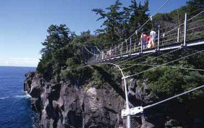 約4000年前,大室山噴發的火山熔岩流到海岸,加上海浪侵蝕形成的陡峭懸崖,沿著長達9公里的海岸線能遠望伊豆七島,隔著海岬也能眺望美麗的天城連山。走在海面上空的門脇吊橋,聆聽斷崖絕壁間的海浪聲。