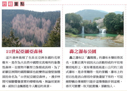 ● 肥前吉田燒窯元會館 <起點> → 大定寺.吉浦神社(0.2km) → 西吉田茶園(1.8km) → 西吉田權現&十三佛(3km) → 坊主原茶園(4km) → 22 世紀亞洲之森(5.5km) → 椎葉山莊(8.7km) → 轟之瀑布(10.2km) → 西博爾德溫泉 → 溫泉公園 → 西博爾德足湯(12.5km) <終點>