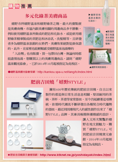嬉野溫泉鄉位於佐賀縣南部,整個溫泉鄉環抱在 雲霧繚繞的山區中,四周被茶田所環繞,空氣 澄淨,水質特別清冽。這裡不僅具美膚效果的溫泉有 名,當地的茶葉名氣也是響叮噹,以優質好茶從2009 年到2013年,連續5年獲得「農林水產大臣賞」和 「產地賞」。