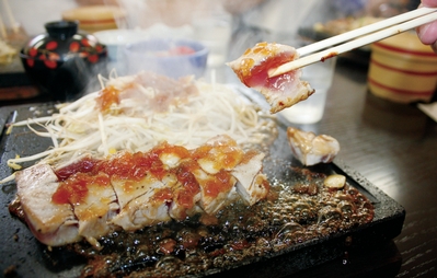 大分縣以新鮮漁產著名,濱茶屋的日向丼(ひゅうが丼)獲得大分美食金賞後,湧入大批饕客,經常人滿為患。鋪滿沾滿醬汁的生鮪魚片丼飯、以熱茶澆上做出半生熟的生魚丼飯口感,十分好吃。而在鐵板上滋滋作響的鮪魚排,表皮熟透、裡面的肉半生熟,吃起來口感絕妙,也是另一道推薦名菜。
