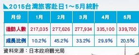 在因著開放天空而使台日雙方航班日趨頻繁、日幣再度跌破新低、眾多樂園推出新主題等眾多吸客因素下, 根據日本政府觀光局統計,今年台灣旅客赴日1到5月份皆交出10%~45%成長率的成績單,累計已達到1,447,400人次造訪,比去年增加27.3%,顯示台灣旅客赴日熱情不減。