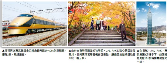 此外,由於3團出發的時間適逢初秋時節,同時為日本賞楓的最佳時機,JAL PAK也貼心嚴選如鬼怒川、日光東照宮等賞楓首選景點,要讓旅客見證歷史畫面之餘,還可順道欣賞火紅「楓」景所帶來的視覺洗禮。