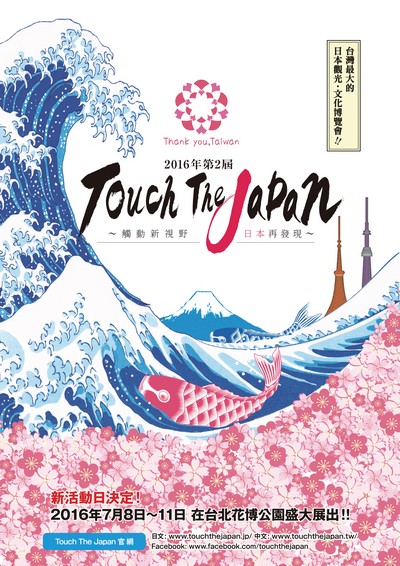 由一般社團法人國際觀光文化推進機構(ITCO)主辦「Touch The Japan 觸動新視野 日本再發現」的日本觀光、文化博覽會,在今年4/17進行 為期4天的展期,造成直客與同業市場的熱烈迴響。而明年的展覽也蓄勢 待發,預計將於2016/7/8假台北花博公園展出,這次更邀請旅行公會 總會共同舉辦,期盼透過觀光及文化的傳遞促進日本與世界的交流,同時 帶動日本觀光旅遊產業的發展,並樹立日本與全球國家地區友好的關係。