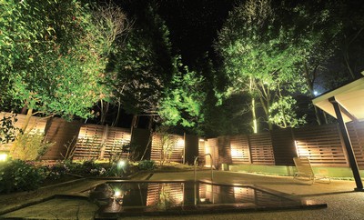 木頭打造的露天大浴槽,旁邊還有高聳的森林樹木圍繞。在這充滿開放感的大自然空間裡,享受讓皮膚變得光滑的鹼性泉質溫泉美人湯,還有療癒系音樂撥放,感受淨化身心的極致森林浴。