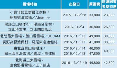每年12月到隔年3月是日本滑雪旅遊的旺 季,旅行業者無不推出滑雪、戲雪、賞 雪的相關產品,從專業滑雪團演變到戲雪、 雪中散步,甚至小朋友也能輕易融入這樣歡 樂的運動中,讓滑雪商機越滾越大,成為冬 季旅行同業銷售的最大獲利來源。