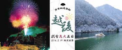 而另一支「冰雪秘境遊船—越後戲雪花火5日」產品, 則帶領旅客一睹宇奈月溫泉每年二、三月,每週六晚間舉 行的雪上花火大會,讓旅客在冬雪藹藹的白色世界欣賞色 彩繽紛的花火,別有一番風味。並前往新潟最著名的苗場 雪場,體驗雪盆、雪屋、雪中輪胎等多重樂趣。