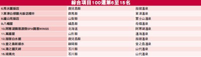 分析比較此次的票選結果,綜合項目 中的前10位排名有些許更動,去年榮獲 第5名的岐阜縣下呂溫泉「水明館」今 年躍升一個名次來到第4名;位居第9名 的福島縣母畑溫泉的「八幡屋」則睽違 8年再次回到前10名寶座。此外,今年 也有6間溫泉旅館首次入選旅館百選。
