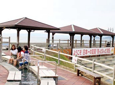 以小濱溫泉源泉的105度高溫為發想所設計出的日本最長足湯,這裡有 能夠優閒坐著泡腳的坐式足湯、能走在溫泉中刺激腳底穴道的健康步道足 湯,以及寵物足湯等…非常推薦旅客來到這裡一面泡著足湯、一面欣賞橘 灣美麗的海景與夕陽風光。另外,就在足湯旁更設置蒸釜與販賣食材的店 家,旅客能在此享用剛出 爐的熱呼呼蒸釜料理,相 當愜意。