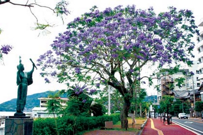 在日本各地都常看到街道兩旁種滿成排的櫻花,不過小濱溫泉的街道 上重的不是櫻花,而是和鳳凰花木、火焰木並稱世界三大花樹的「藍花 楹」。「藍花楹」從5月下旬6上旬進入花季,每年這個時節小濱溫泉就 舉辦浪漫的「小 濱溫泉藍花楹 節」,紫色的花 朵開滿樹頭,一 共有約200棵非 常壯觀。花期長 達一個月,非常 推薦初夏時分來 到小濱溫泉一面 泡最長足湯,一 面賞花。