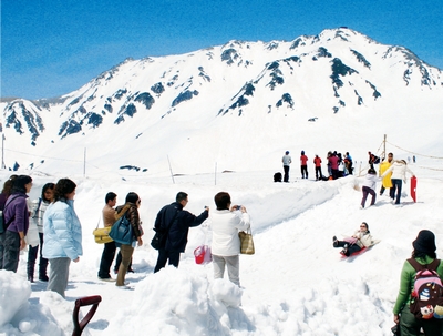 漫步雪之大谷是每年立山黑部開山後的重頭戲。平日上 午10點至下午3點15分(週末及例假日為上午9點半開始), 遊客可以漫步在天狗平至室堂平間的雪壁廊道中,近距離 欣賞兩側逾15公尺的巨大雪牆,感受歷經近半年冰封期的 豐厚積雪在人類力量的開鑿下所形成的震撼奇景及其散發 出的磅礡氣勢,直至初夏都還能維持10公尺高。此外,今 年會場亦將贈送「雪之大谷通行證」以茲紀念。