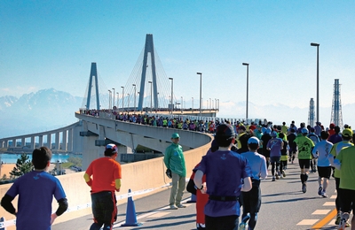 新湊大橋擁有兩層構造,上 方為汽車行駛的道路,下方則 提供給行人徒步通過。在新湊 大橋上迎風奔跑,可將3,000公 尺級的立山連峰盡收眼底,橋 旁停放的海上貴婦人「海王丸 帆船」,29張風帆同時展開的 壯觀震撼力滿點。跑者可在此感受到濃厚的港都風情。