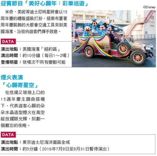 東京迪士尼海洋15週年慶活動以「心願」作為活動主題,迪士尼明星們期待與遊客共享在許願時那份對美好未來的憧憬,以及實現心願時朝向夢想前進的雀躍之情。其中期間限定的港灣娛樂表演「閃亮心願之旅」、迎賓節目「美好心願年:彩車巡遊」,以及夜晚的煙火表演「心願寄星空」等,都是必看節目。此外,即將於7月登場的全新音樂劇「走出闇影森林」也令人期待。