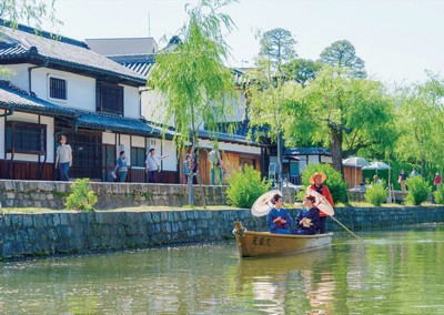 倉敷地區完整的保存了江戶時期所遺留下的倉 庫及商家建築,沿著運河散步,欣賞兩旁嫩綠垂 柳及白牆 上鑲嵌著 黑瓷磚的 傳統日式 建築,浪 漫的懷舊 情調令人 陶醉。