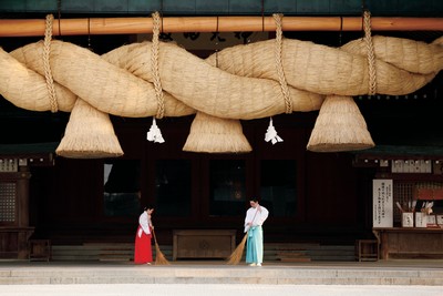 素來以「善 結良緣」而聞名 的出雲大社,擁 有日本最古老的 神社建築,其正 殿前用以表現神與凡人界線的3噸重巨大「注連 繩」更是出雲大社的象徵。其地位之崇高,堪稱 日本最具代表性的神聖之地亦不為過。