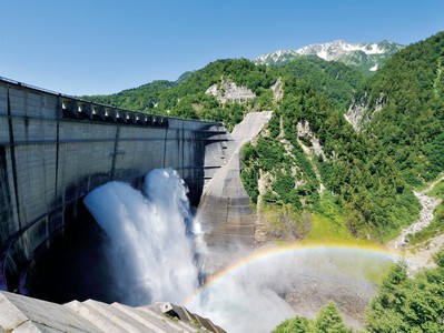 立山黑部夏天最令人期待的重頭戲 首推「黑部水庫」洩洪。海拔1,500公 尺的黑部水庫是日本第一高處的拱型 水庫,洩洪時以每秒10頓以上的水量 滾滾流洩而下,晴天時就能欣賞到太 陽的照射下出現的彩虹!今年的洩洪 期間為6月26日至10月15日,為期約3 個半月。