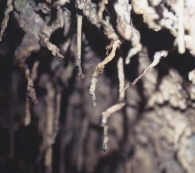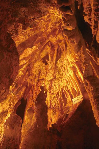 寬度僅有2~5毫米、如豆芽般 粗細,呈螺旋狀往不規則方向生 長的鐘乳石,只有在高濕度及密 閉的空間中才有機會生長,可謂 相當罕見的景象。生成的位置從 洞穴頂端、鐘乳石、以及岩壁都 有,數量是全日本觀光鐘乳石洞 中最多。