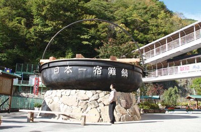 被放置在飛驒大鐘乳石洞 停車場的大鐵鍋,直徑 6.1公尺、深1.73公尺、 重達9公噸。過去是「丹 生川宿儺祭」的重要角 色,為了慶祝豐收,縣民 會利用這個宿儺鍋烹煮 味噌火鍋分送給每位到訪 的遊客。然而,隨著鍋子 逐漸老舊且不敷使用, 2007年後這個宿儺鍋就 成為特別的裝置藝術。