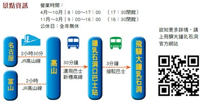 飛驒大鐘乳石洞位處海拔900公尺,是 日本第一高的鐘乳石洞。洞內全年 平均溫度維持在12度左右,是絕佳的避暑 勝地!前往岐阜高山,多半由名古屋或富 山進入,除了華航每周提供4個航班直飛 富山機場,自2016年開始每天有超過6航 班直飛名古屋,其中更包含捷星、威航以 及虎航3家LCC,航空運量增加連帶提供旅 遊業者們更多元化的商品設計素材,也使 FIT旅客前往高山更加方便。此外,加上 北陸新幹線的開通,從東京前往富山只要 2小時8分,讓原本進出的名古屋、大阪航 點之外,從東京出發也成了包裝商品的新 優勢。鄰近周邊位置還有知名的新穗高纜 車,搭乘纜車俯視腳下壯闊的山林美景以 及擁有「岐阜小京都」稱號的高山市古町散策,或是世界遺產白川鄉合掌村,在浪 漫童話國度感受日本原初之美。