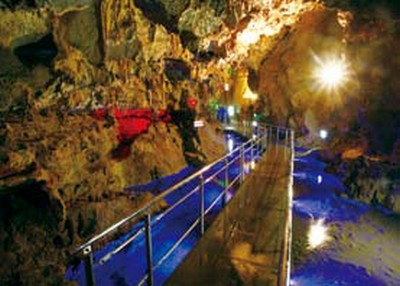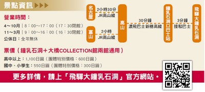 日本國內的鐘乳石洞超過80 處,其中「飛驒大鐘乳石 洞」以乳白色細長的鐘乳石為特 徵,擁有全日本最多的「蜷曲鐘乳石」,是只有在高濕度及密閉的空 間才有機會生長,寬度約2~5毫 米、如豆芽般粗細,呈螺旋狀往不 規則方向生成,可謂相當罕見的景象。飛驒大鐘乳石洞總長約1.8公 里,可參觀的部分約800公尺,分有3個洞穴,每個洞穴都有各自的出口,旅客可以依照個人喜好以及體力,自由安排參觀路線,走完全 程大約需要40分鐘。通道時而狹窄時而寬闊,時而陡峭,搭配昏暗的 光線更加襯托出鐘乳石洞的奧秘, 漫步在這個充滿神秘感,有如古羅馬帝國宮殿般的大鐘乳石洞,令人有種探險的感覺。
