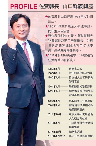 去年剛上任的佐賀縣長山口祥義22年前第一次來到台灣,和台灣長久以 來有十分密切的接觸,這次是第7次訪台,對於台灣最深刻印象的就是人 情味令他十分難忘,以前員工旅行來台灣時還結交了朋友,山口祥義縣 長也表示佐賀縣也同樣擁有濃厚的人情特色,再加歷史文化、美食與美 景,非常推薦台灣朋友來體驗另一種不同的日本。同時也兼任佐賀觀光 連盟會長的他,首次領軍縣內5大城市代表與在地業者前來台灣召開說明 會,希望以此為起點,與同業交換意見,讓佐賀縣的美好可以包裝成旅 遊商品,分享給更多台灣人知道。