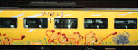 車廂彩繪的是獅子老爹帶著小獅子們出門散步,發現全身長滿刺的豪豬,淘氣地玩起追逐遊戲!