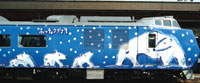 整個車廂彩繪北極熊親子家族的背後跟著北海道狐狸,天空還有白色貓頭鷹盤旋飛翔,呈現出一片銀色動物世界。