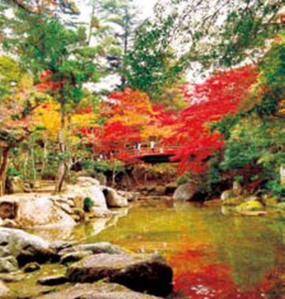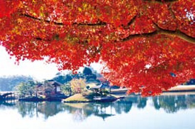 岡山後樂 園在秋天會 換上另一種 風貌,園內 歷史悠久的 名勝「千入 之森」,擁 有紅葉林木景觀,也可以看到融入其中的神社 寺院,更增添和風秋意。