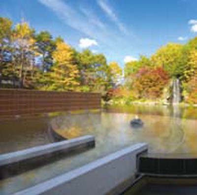 ▲美膚效果卓越的露天溫泉「浮湯」是青森屋的招牌。泡湯同時還能欣賞林間瀑布美景。