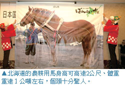 而除了優美宜人的自然景色之外,十勝也舉辦各種豐富的活動,本次說明會中便特別介紹僅在十勝帶廣市才有舉行的重量級賽馬—「BANEI賽馬」,由騎師駕馭著身高體重均為一般競賽馬兩倍的馬匹,馱著重達1公噸的鐵橇在長200公尺的跑道上奮力前進,為十分具震撼力的畫面。另外於10/26~28也將舉辦亞洲唯一的一場世界汽車拉力選拔賽,屆時將會有各國好手前來參加,預料將會是十分精采的一場賽事。