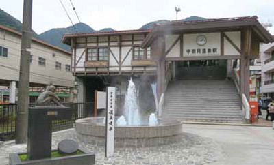 ▲宇奈月溫泉站出口廣場的溫泉噴泉。