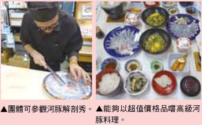 下關是日本最大的河豚集散地,約佔8成的捕撈產量,也是主要的加工區,因此可以超值價格品味高級河豚料理。可容納10輛大巴士的「長府觀光會館」有個下關河豚海產中心,只要5000日幣就可提供一團體參觀河豚料理解剖秀,而鎖定團體的餐廳內,河豚美味從1300日幣的釜飯定食至有河豚涮涮鍋、河豚雜炊的6480日幣頂級料理都可品嚐。