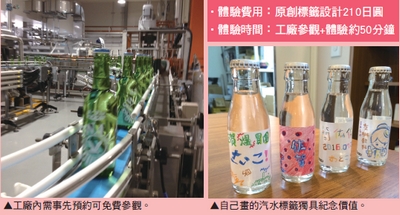 飲料小城工廠使用純淨的螢之鄉天然水,製作出「小朋友啤酒」等多種碳酸飲料,這裡除了可以參觀工廠的生產流程、體驗「小朋友啤酒」的製作,還能自己獨創特殊口味的碳酸飲料,現場還提供免費試飲呢!另外,花一瓶汽水的費用就能體驗設計自己原創的汽水瓶標籤,當作旅行中的紀念品非常不錯。
